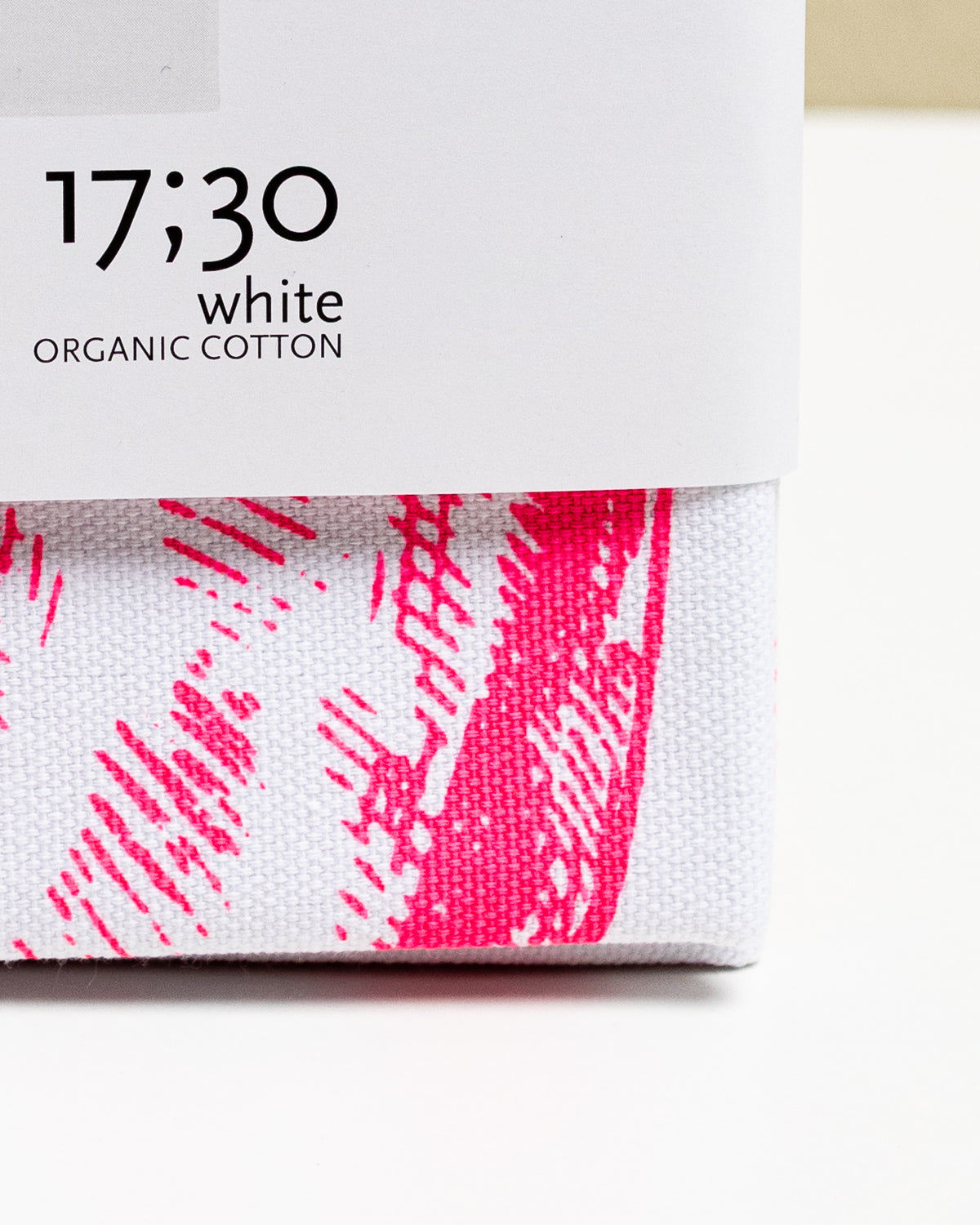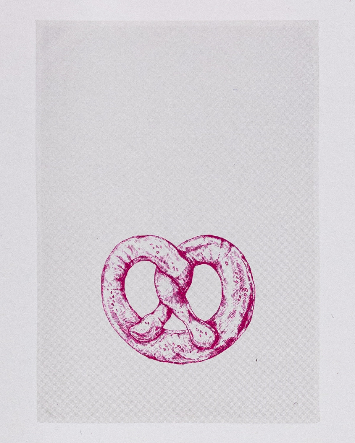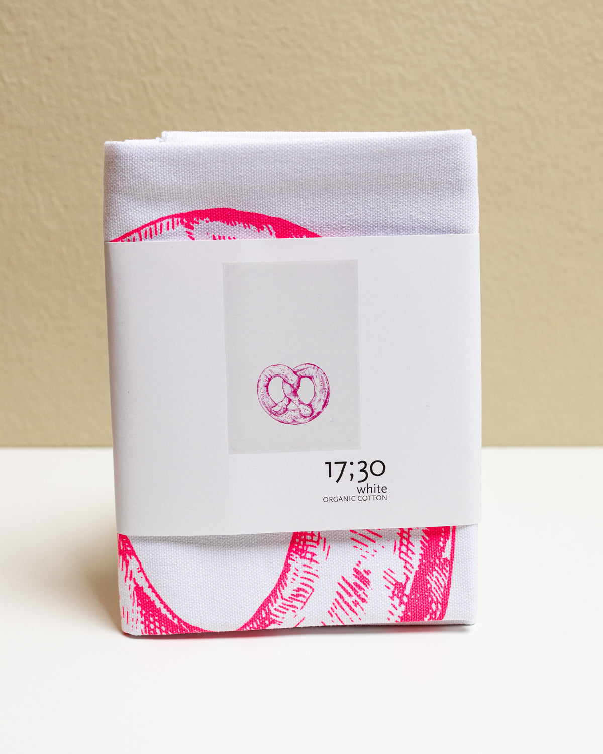 Weißes Geschirrtuch mit pinker Zeichnung einer Breze - Siebdruck.