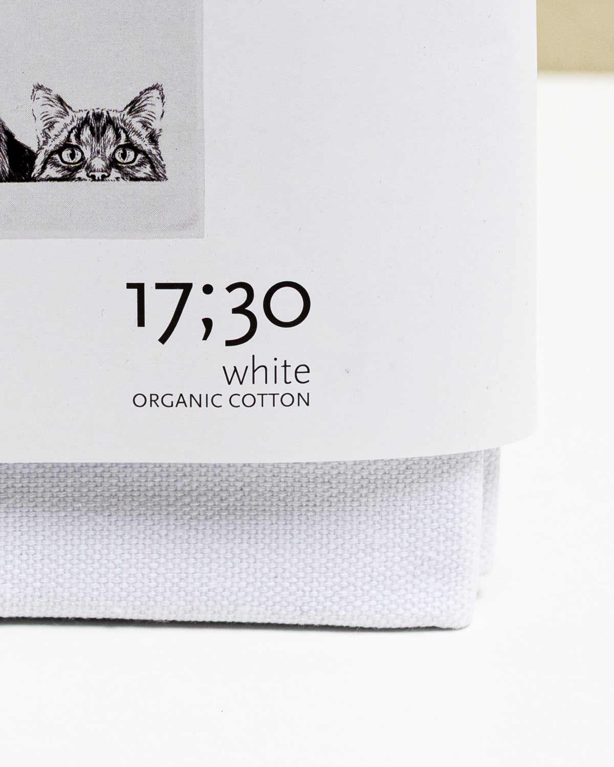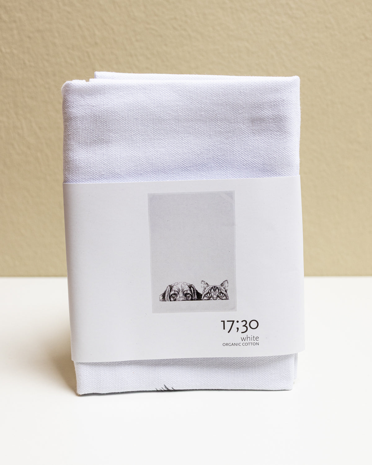 Weißes Geschirrtuch mit schwarzer Zeichnung von Hund und Katze - Siebdruck.