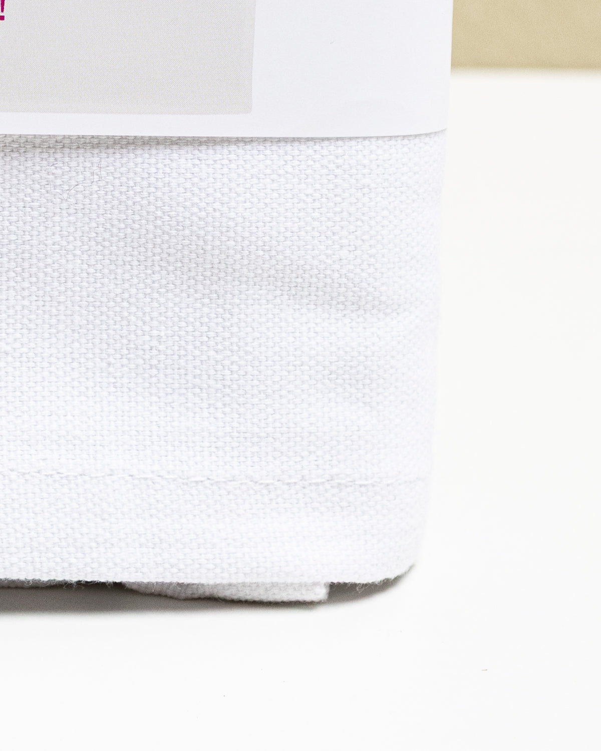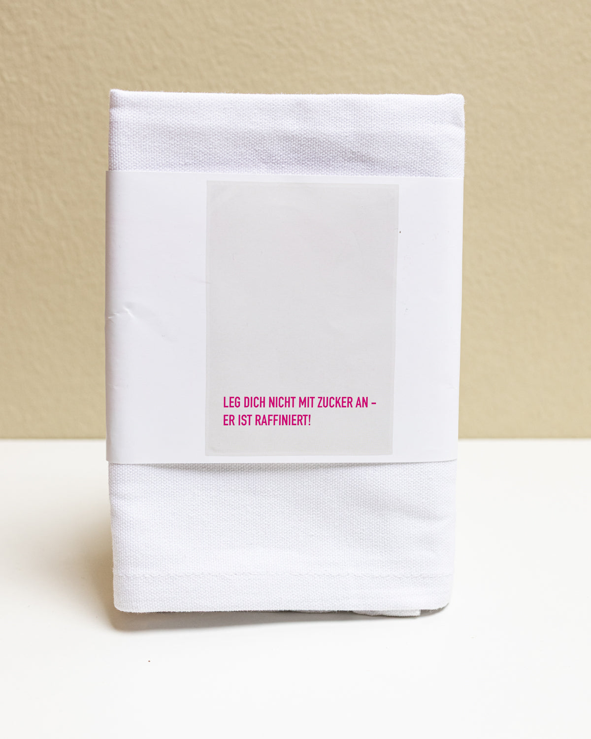 Weißes Geschirrtuch mit pinken "Leg dich nicht mit Zucker an - er ist raffiniert!" Aufdruck - Siebdruck.