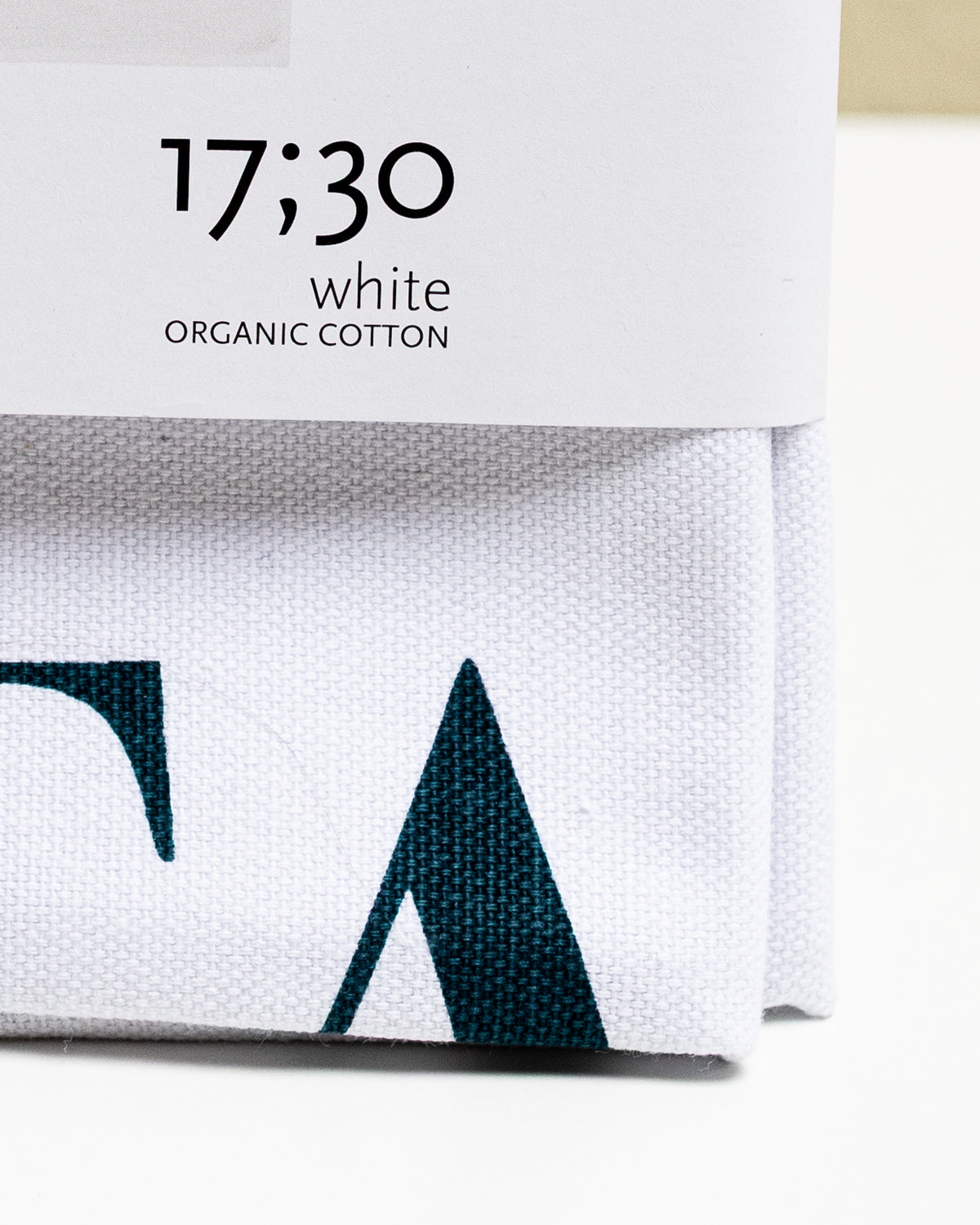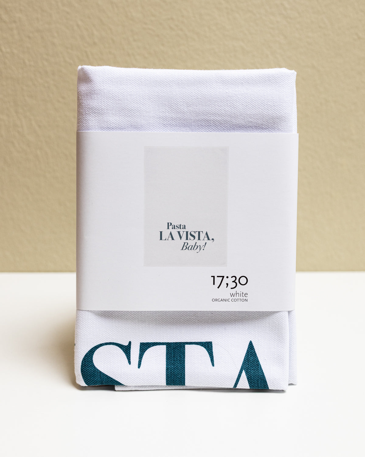 Weißes Geschirrtuch mit grauem "Pasta La Vista, Baby!" Siebdruck.