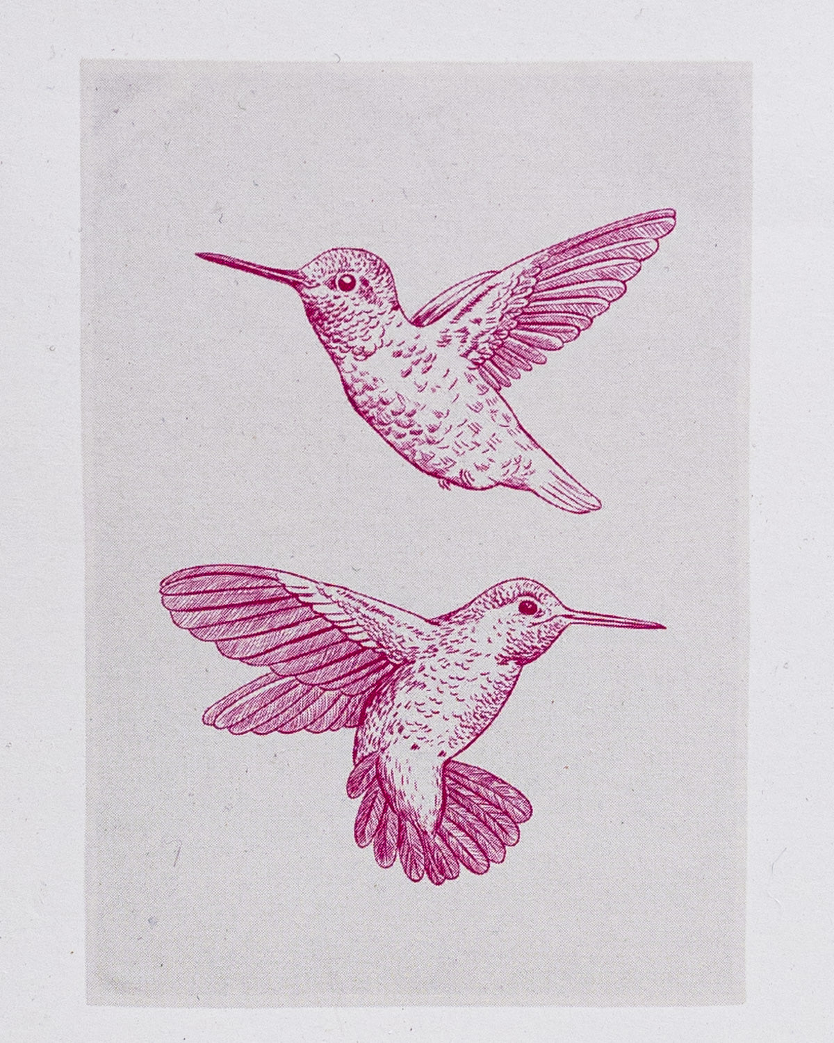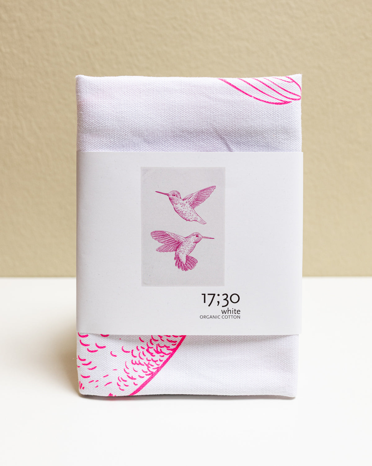 Weißes Geschirrtuch mit pinker Zeichnung 2 Vögel - Siebdruck.