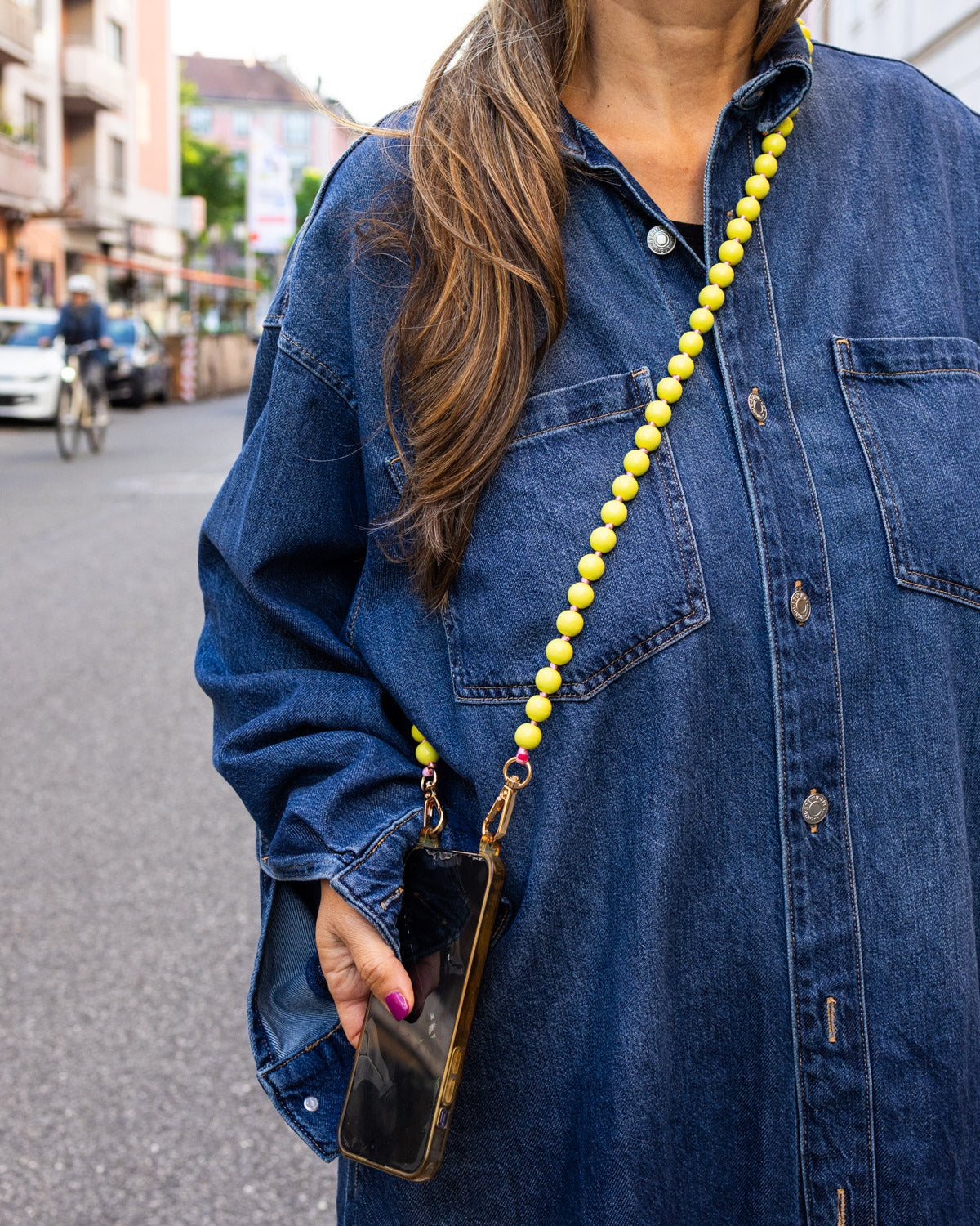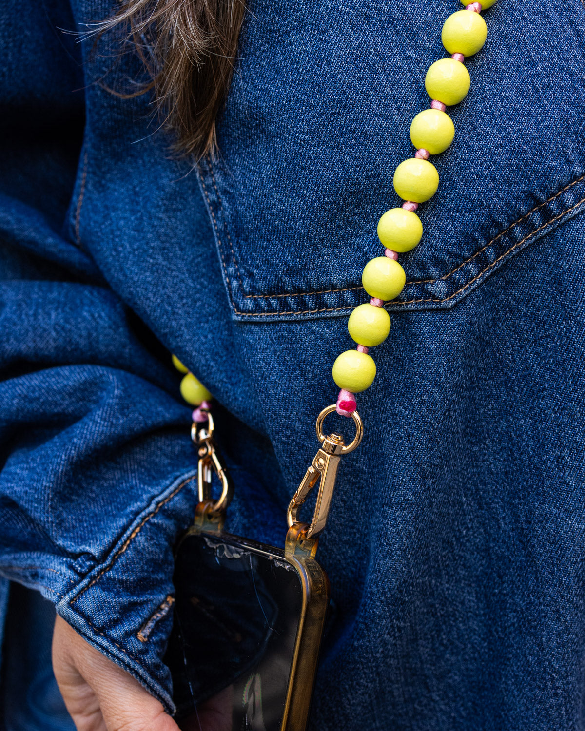 Eleganz, die begeistert. Diese hochwertige Crossbody-Kette aus handgefädelten Holzperlen kombiniert funktionale Freiheit mit einem edlen, farbenfrohen Statement. Ausgestattet mit Premium Gold-Karabinern und schadstofffreier Lackierung. Das subtile Mimi’s Glow Logoherz setzt einen besonderen Akzent. Ideal als Handy-Kette, für Schlüssel oder Taschen. Ein tolles Geschenk für alle, die Design lieben. (Befestigungspatch nicht enthalten).