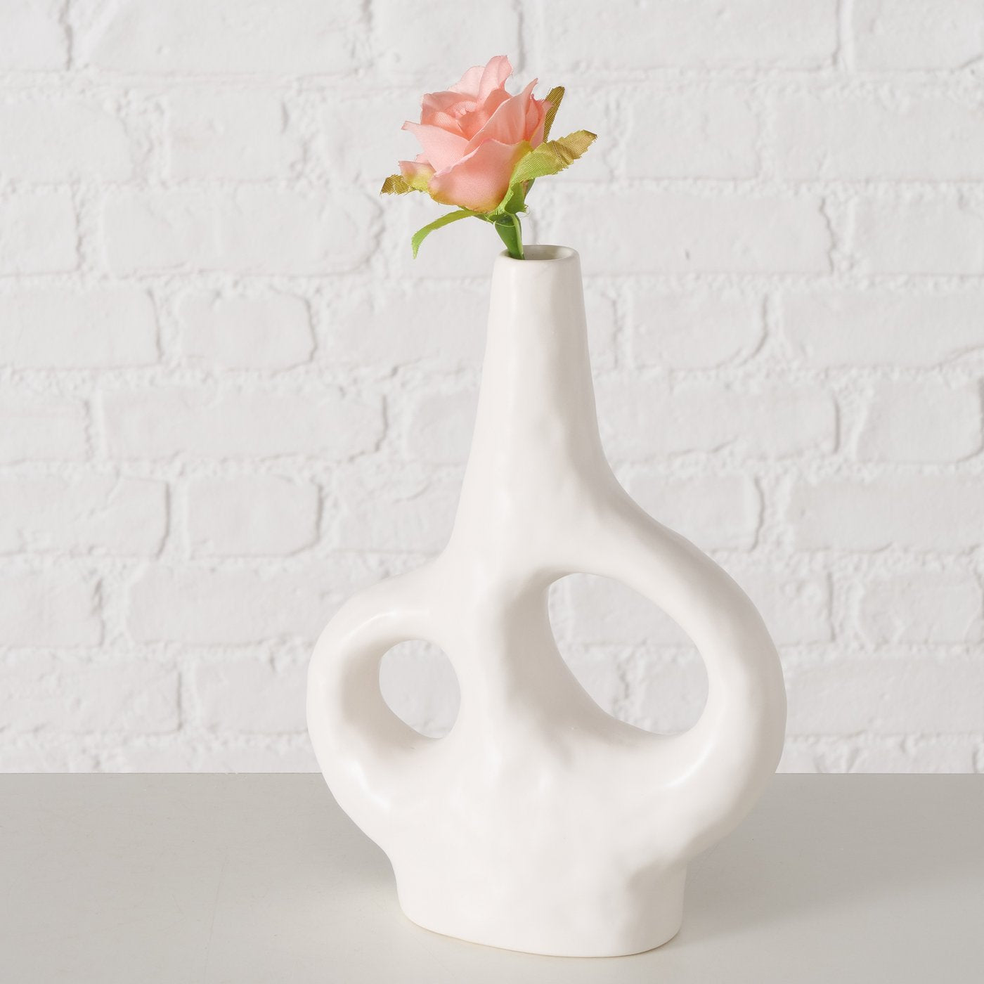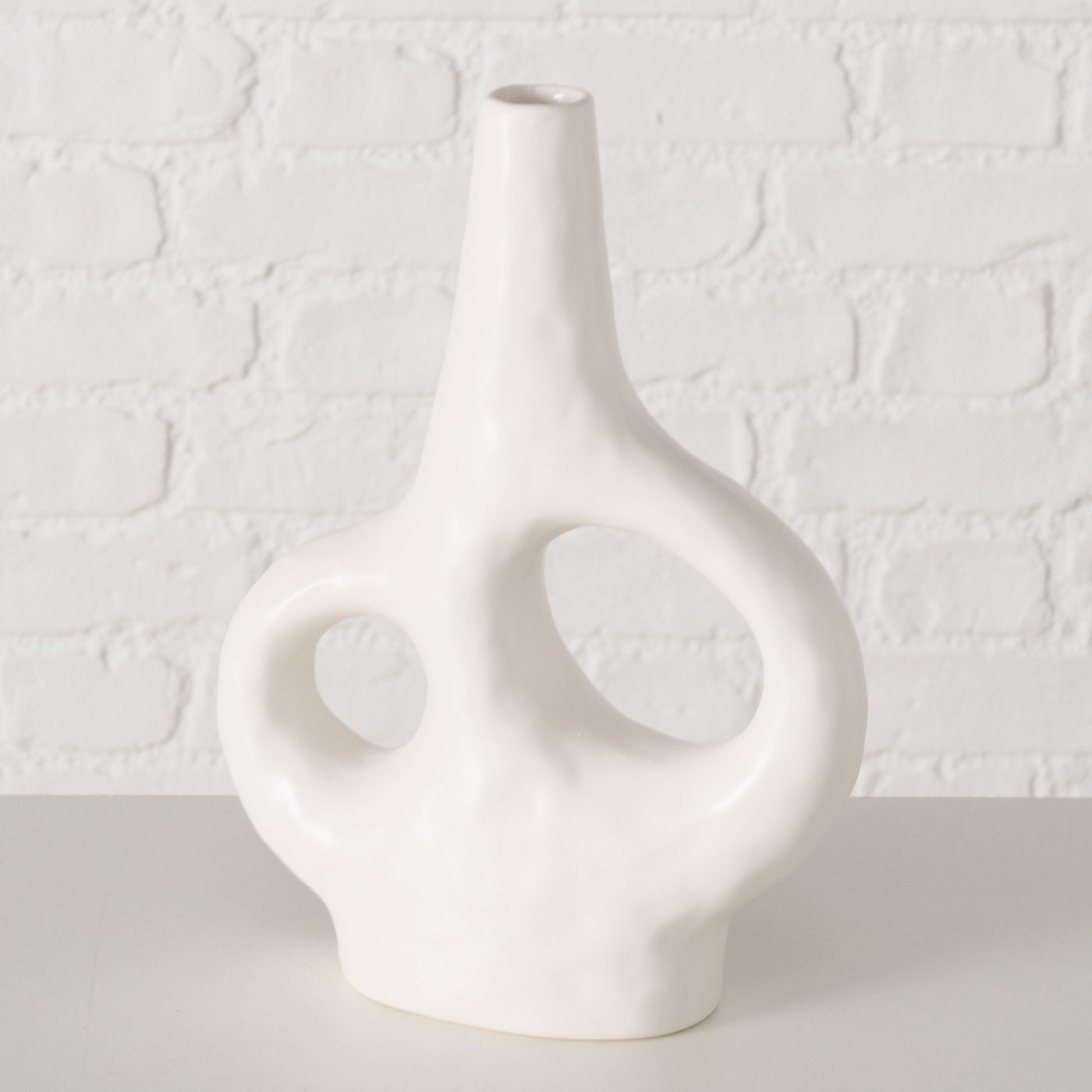 Diese handgefertigte Keramikvase aus weißem Steingut ist ein absolutes Unikat. Die matte, lasierte Oberfläche verleiht ihr einen zeitlosen und eleganten Charakter. Mit ihren großzügigen Maßen (H 28 cm, B 7 cm, T 20 cm) ist sie ein echter Blickfang in jedem Raum.
